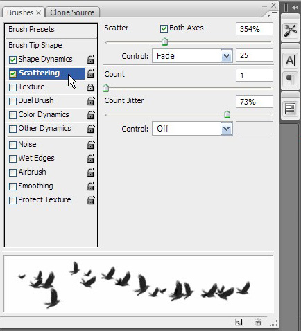 Now, click on "Scattering," as well as thus gear upwardly the sactter slider equally depression or high equally you'd like. You tin run across how much it's scattering inwards the thumbnail. Click on "Brush Tip Shape." Move the "Spacing" slider to the correct until the brush is spaced how you'd like. Make sure the balance is gear upwardly at 0% or off.